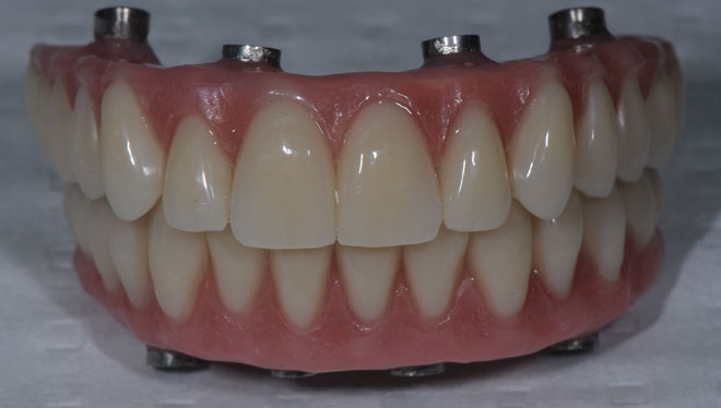 The lip and cheek support is provided by the implant bridge without the need for un-cleanable flanges, often necessary with traditional full jaw implant bridgework.